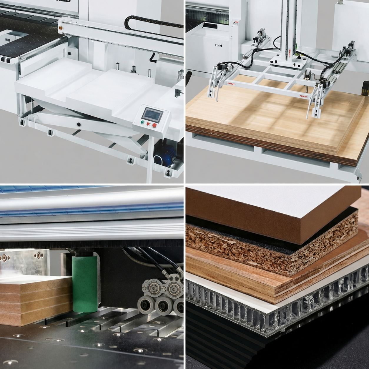 Stroj je opremljen CNC upravljanjem s Delta PLC sustavom, industrijskim računalom i 19″ monitorom za jednostavno programiranje i optimizaciju rezanja. Dodatne opcije poput podizne platforme, gantry sustava s vakuumskim hvataljkama i automatskog bočnog poravnanja dodatno povećavaju brzinu rada i razinu automatizacije.