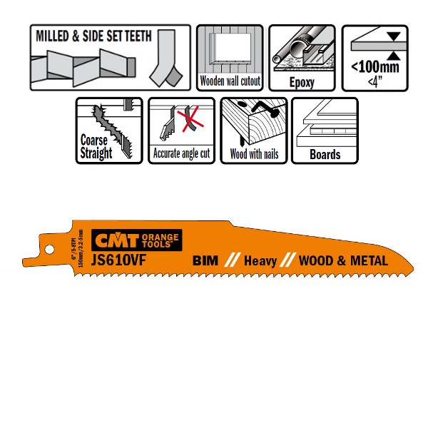 Za rezanje drva sa čavlima, metalom ili plastičnim profilima debljine manje od 100 mm, plastike / epoxyija ojačanog staklenim vlaknima s manje od 50 mm, drvenih ili metalnih okvira za prozore.